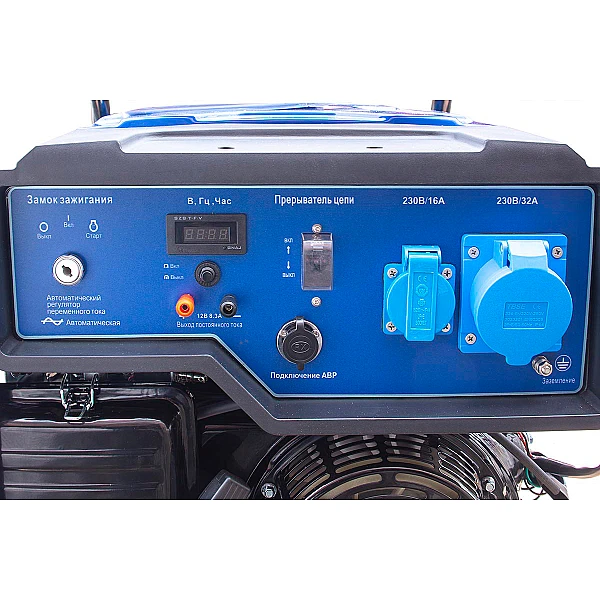 Небольшой ЖК-экран дает возможность контролировать параметры выходного тока, а также отслеживать показатель наработки для своевременного проведения техобслуживания бензогенератора.