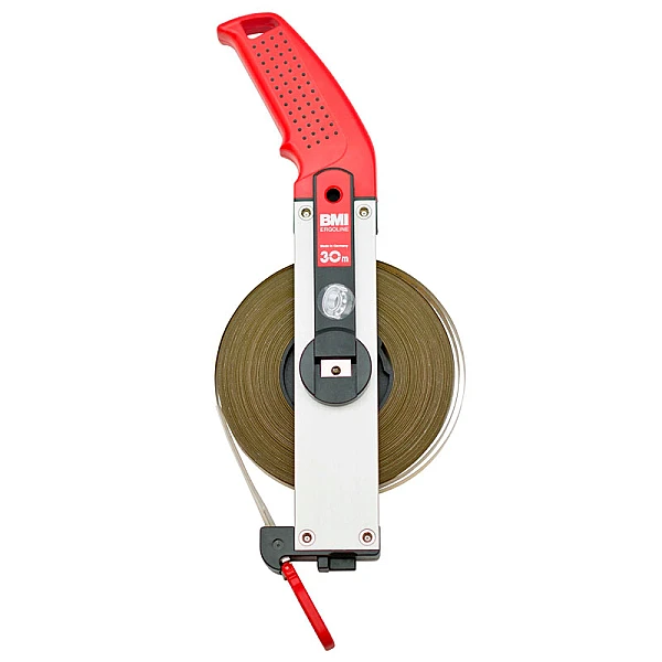 Лента измерительной рулетки BMI ERGOLINE 30 M производится из высокоуглеродистой стали высокой прочности и имеет длину 30 метров. Поверх полотна наносится тонкий слой полиамида, исключающий истирание ленты. Сверху по антикоррозионному покрытию наносится измерительная шкала черного цвета с точность 1 мм.