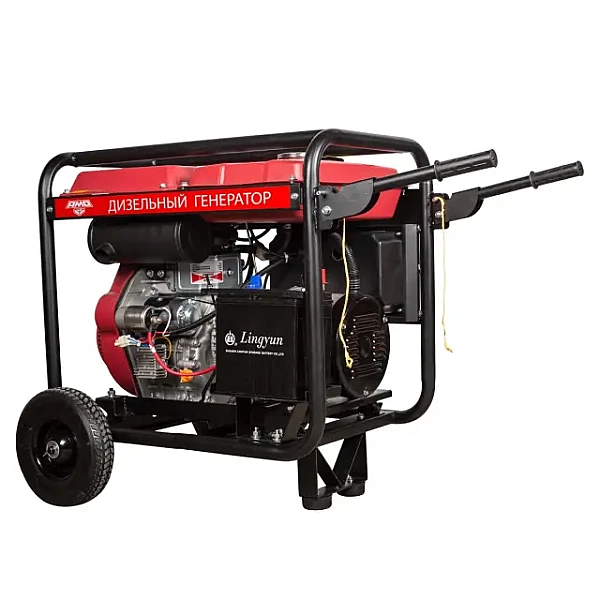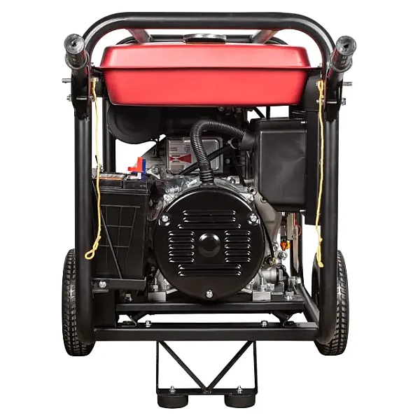 Установка оборудована электростартером, что позволяет быстро и удобно запускать ее поворотом ключа. Такое решение особенно актуально на выезде и для решения задач, требующих частых перестановок. Электростартер питается от аккумулятора, который подзаряжается в процессе работы. Возможность ручного запуска сохранена, она может пригодиться в непредвиденных ситуациях.
