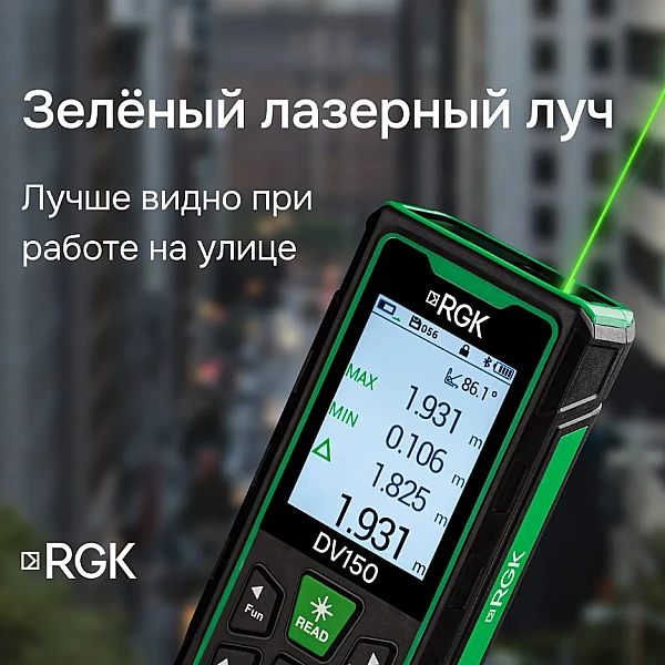 Дальномер RGK DV150 оснащен мощным лазером, который позволяет измерять расстояния на удалении до 150 метров с двухмиллиметровой точностью, что позволяет работать не только в помещениях, но и на улице. Отличительной особенностью дальномера RGK DV150 является наличие яркого лазерного маркера, облегчающего наведение на цель.