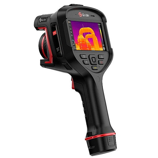 Тепловизор Guide H3+ (Hammer Series) оснащён детектором с разрешением 384 x 288 пикселей и чувствительностью 45 мК, частота кадров 30Гц. Диапазон измерения температуры -40°C +150°C, 0°C +650°C с автоматическим переключением режимов работы, 5 режимов фокусировки. Опционально от 500°C до 2000°C. Тепловизор оснащён 8 мегапиксельной камерой, есть функция наложения изображений, фото с камеры видимого спектра на термограмму, в результате получается более чёткое ик-изображение за счёт прорисовки краёв объектов. В комплекте с камерой два аккумулятора, зарядки хватает на 5 часов работы. Используется в промышленности
