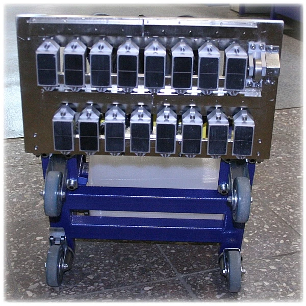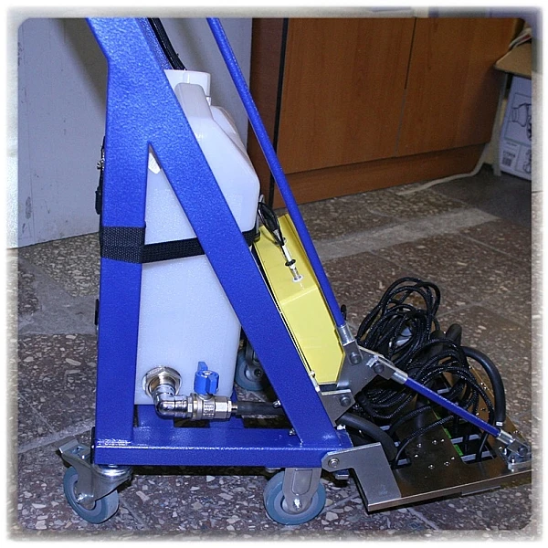 Перемещение тележки осуществляется на колесах. Для легкого подъема и опускания акустического блока на механической части установлен рычаг