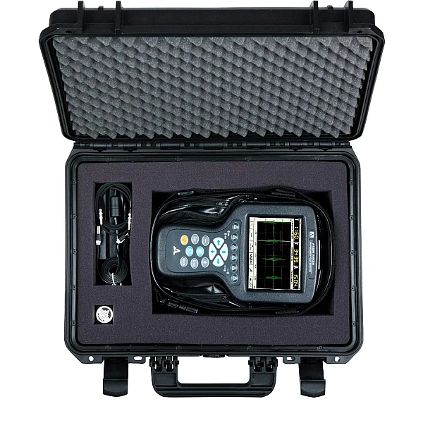 Дефектоскоп представляет собой компактный электронный блок с большим высококонтрастным цветным TFT дисплеем и клавиатурой. На дисплее отображаются результаты измерений в виде А-скана сигнала.