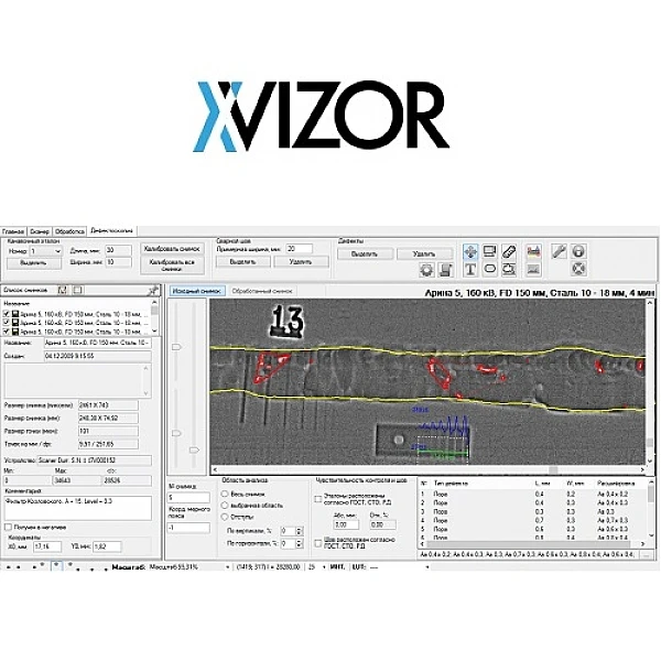 "X-Vizor" - 64-битная программа (для работы в более ранних операционных системах может использоваться 32-битная версия программы) для получения, анализа и обработки рентгеновских изображений, полученных в процессе осуществления радиографического контроля, а также для автоматизированного заполнения протокола контроля, архивирования изображений и отправки результатов контроля в базу данных.